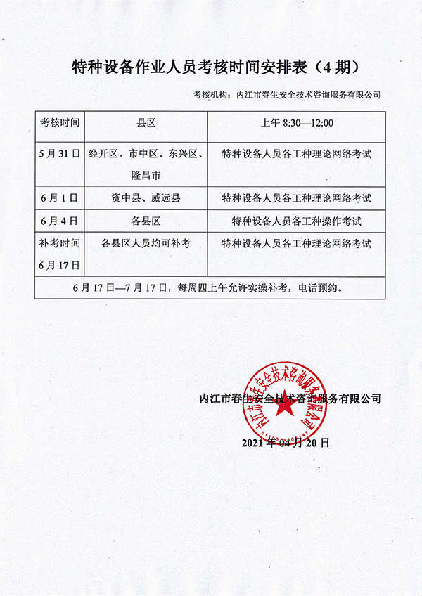 2021年春生公司04期特種設備作業(yè)人員考核時(shí)間安排