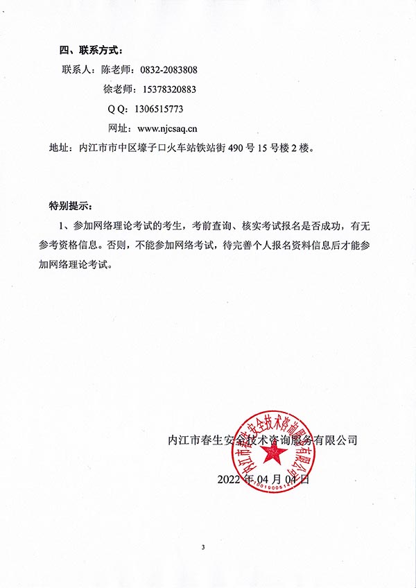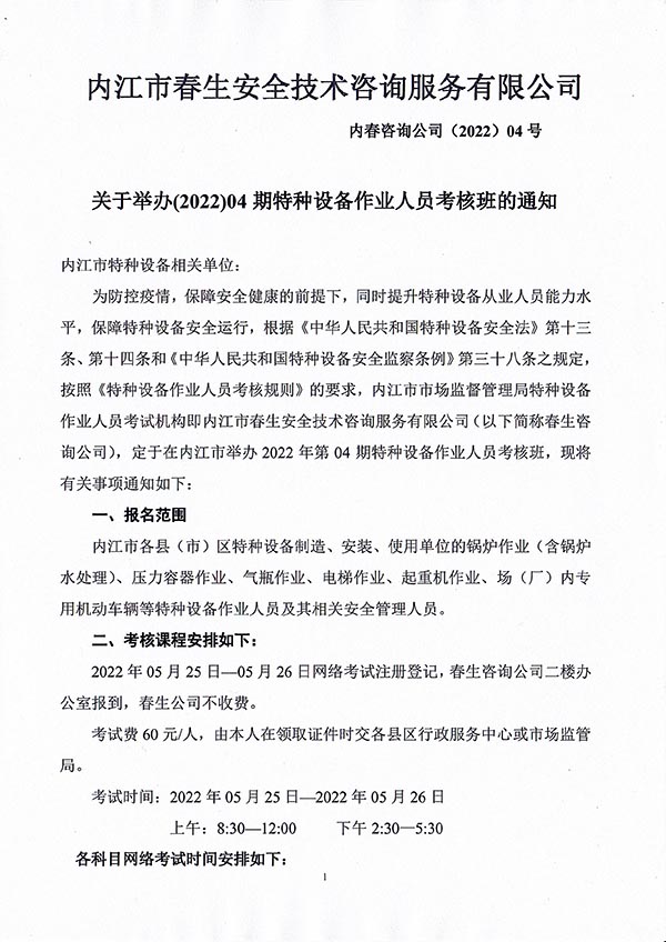 2022年春生公司04期特種設備作業(yè)人員考核時(shí)間安排