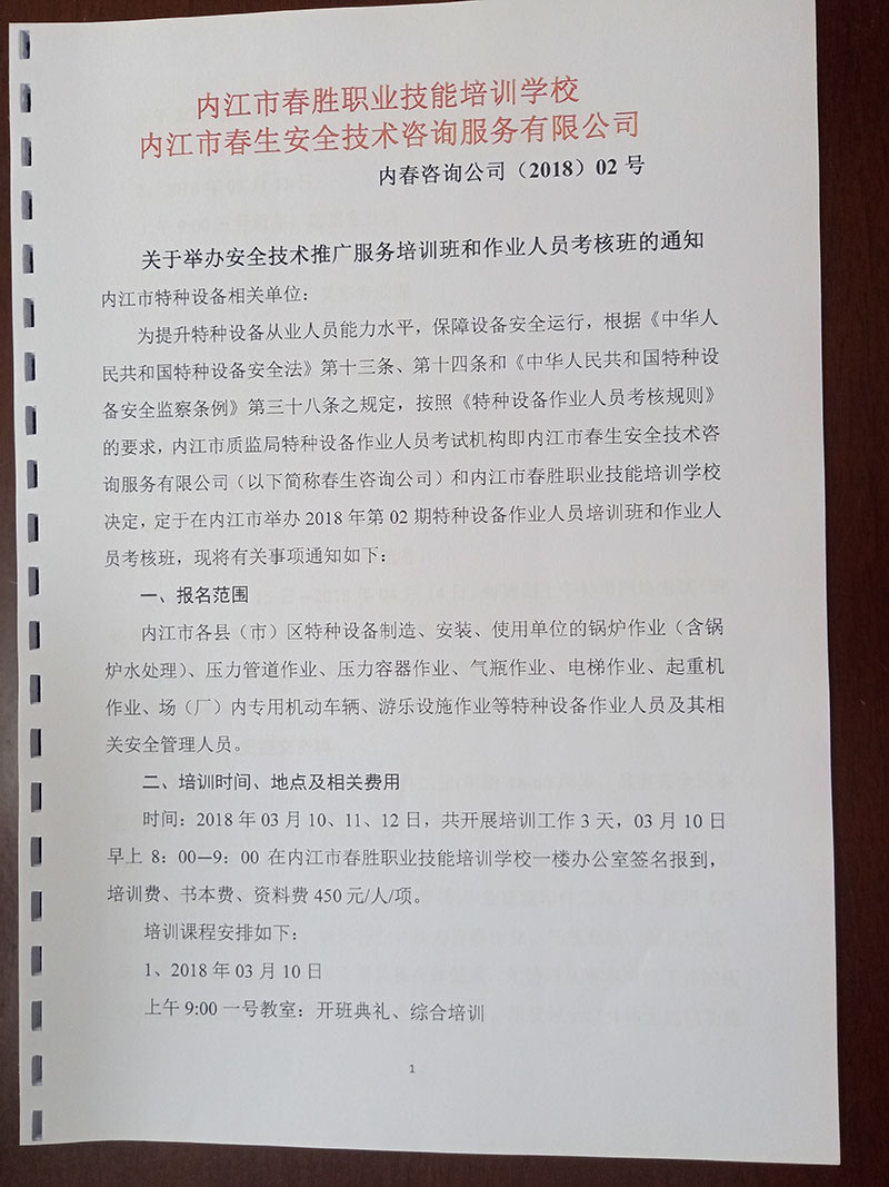 關(guān)于舉辦安全技術(shù)推廣服務(wù)培訓班和作業(yè)人員考核班的通知