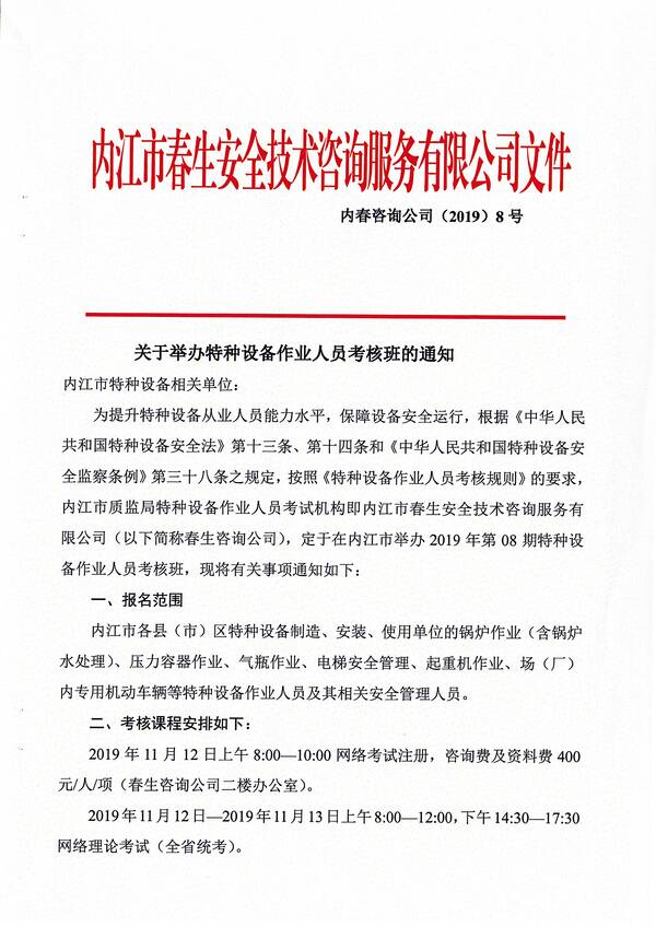 2019年第八期特種設備作業(yè)人員考核培訓班的通知